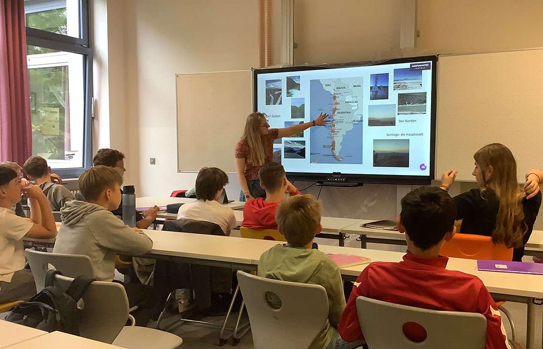 Mit Begeisterung und Neugier folgten die jungen Zuhörer am Mittwoch, 3. September, der Präsentation von Lena Sommerlad, die nach ihrem Abitur am RBG im Frühjahr 2024 ein Jahr im Kinderheim Juntos Hogar Campo als Freiwillige gearbeitet hat. Vor wenigen Wochen zurückgekehrt und auf dem Sprung ins Studium, hat sie in zwei Lerngruppen der 6. und 8. Jahrgangsstufe von ihren vielfältigen Erfahrungen berichtet und uns auf den neuesten Stand von Heim und Schule gebracht.