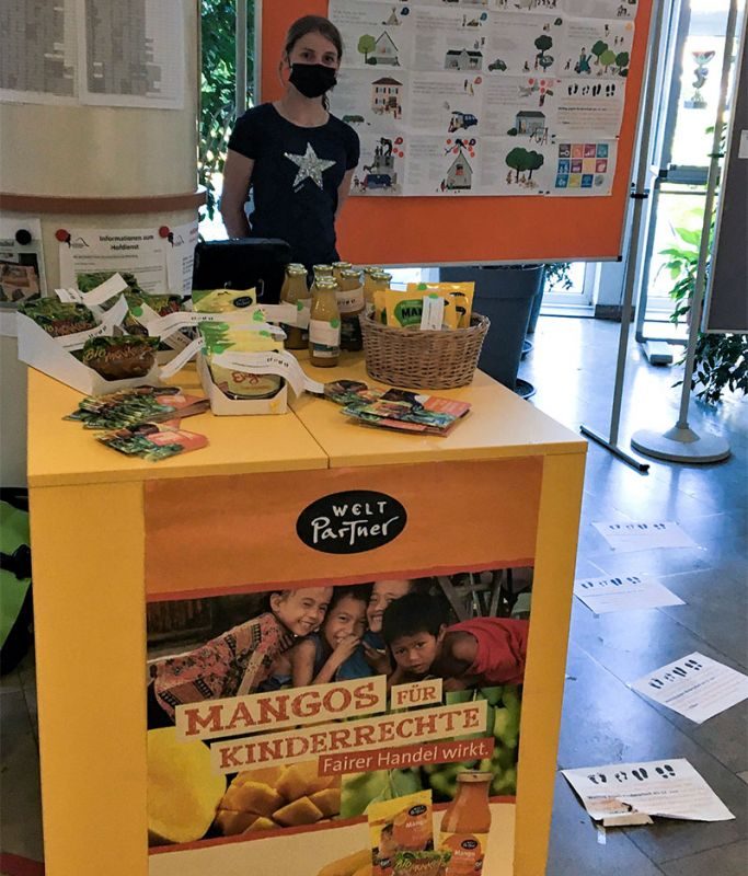 Jedes Kinderrecht ist wichtig, mit einem roten Punkt kann jede und jeder aus der Schulgemeinschaft auf der Tafel im Foyer markieren, was das Allerwichtigste ist! Und oder leckere Mango-Snacks am Stand der AG „fair trade school“ kaufen! 10% des Preises gehen direkt an Kinderrechtsorganisationen auf den Philippinen, und die faire Bezahlung der dortigen Mangobauern unterstützt Eltern und Kinder.