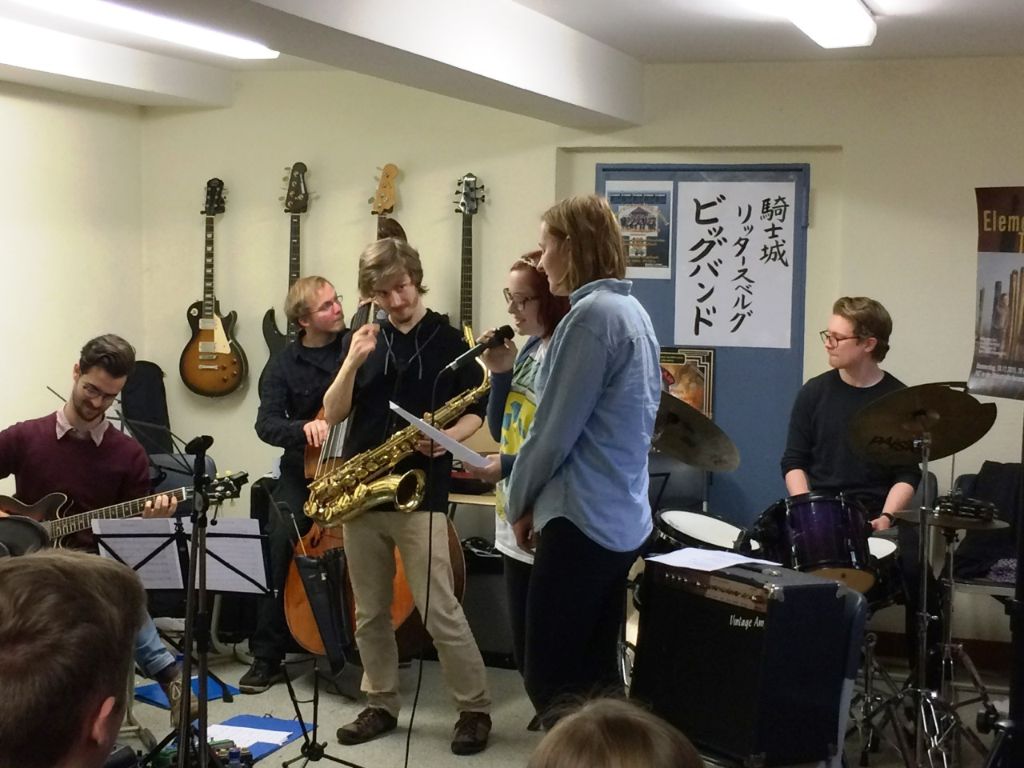 Am Donnerstag, den 10.12.2015 gab das Jazz-Quartett „Elements of Tomorrow“ am Rittersberg-Gymnasium ein Gesprächskonzert für Schüler/-innen aus der Mittel- und Oberstufe im Big Band-Keller der Schule. Florian Boos, ehemaliger Saxophonist der Rittersberg Big Band und zur Zeit Jazz-Student an der Folkwang-Hochschule in Essen, führte zusammen mit seinen Studienkollegen die Zuhörer in die Welt des zeitgenössischen Jazz ein. Ganz spontan sangen auch die Big Band-Sängerinnen der Schule in zwei Stücken mit unseren Gästen aus Essen zusammen. Am Abend gab es dann noch ein beeindruckendes Konzert von „Elements of Tomorrow“ im JuZ.