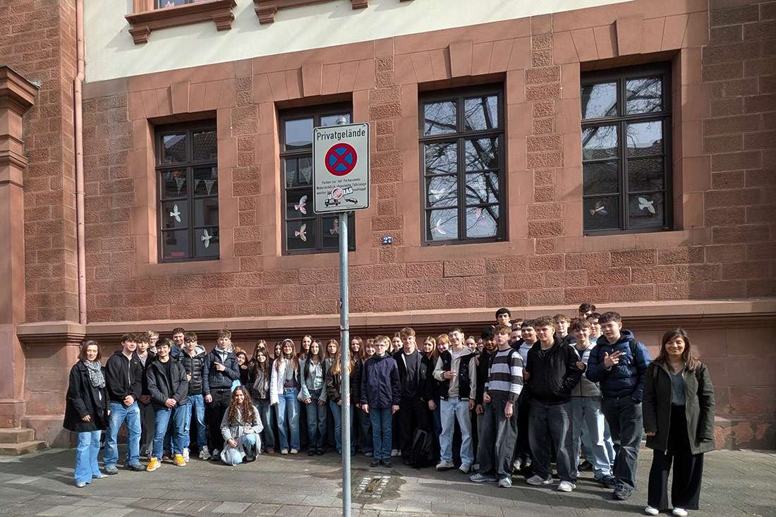 Am 6. März waren die Klassen 10a und 10b im Rahmen des Geschichtsunterrichts zu Gast an der GS Röhmschule. Grund für den Anlass des Unterrichtsgangs war die Verlegung der ersten Stolperschwelle in Kaiserslautern zur Erinnerung an die Schülerinnen und Schüler der jüdischen „Sonderklasse“ von 1936 bis 1938.