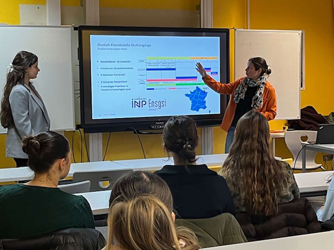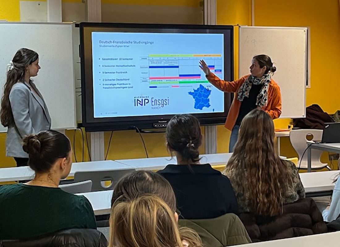 Staunen macht sich breit in der Informationsveranstaltung für die Leistungskurse Französisch der MSS. Am Dienstag, den 10. Februar 2026 hatte die Fachschaft Französisch die Studiengangmanagerin, Frau Dr. Carolin Sator von der RPTU Kaiserslautern-Landau zu Gast am RBG. Anhand einer Präsentation der Deutsch-französischen Studiengänge erläuterte sie, unterstützt von Fanny Herrada, einer frisch diplomierten Französin dieses Studiengangmodells, die vielfältigen Möglichkeiten der Ingenieursstudiengänge und des Lehramtsstudiums für Französisch und Deutsch.