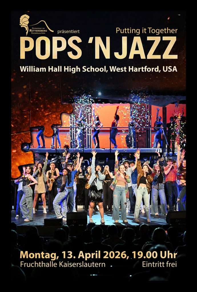 Mit der Big Band des Pops’n’Jazz-Ensembles führt die Rittersberg Big Band seit dem Jahr 2000 einen regelmäßigen Konzert- und Schüleraustausch durch. Und so gastiert “Pops’n’Jazz“ bereits zum 11. Mal in Kaiserslautern und präsentiert seine garantiert atemberaubende Konzert- und Bühnenshow: Ein Muss für alle Jazz-, Rock- und Pop-Fans sowie alle musikinteressierten Rittersbergerinnen und Rittersberger! Der Eintritt ist frei.